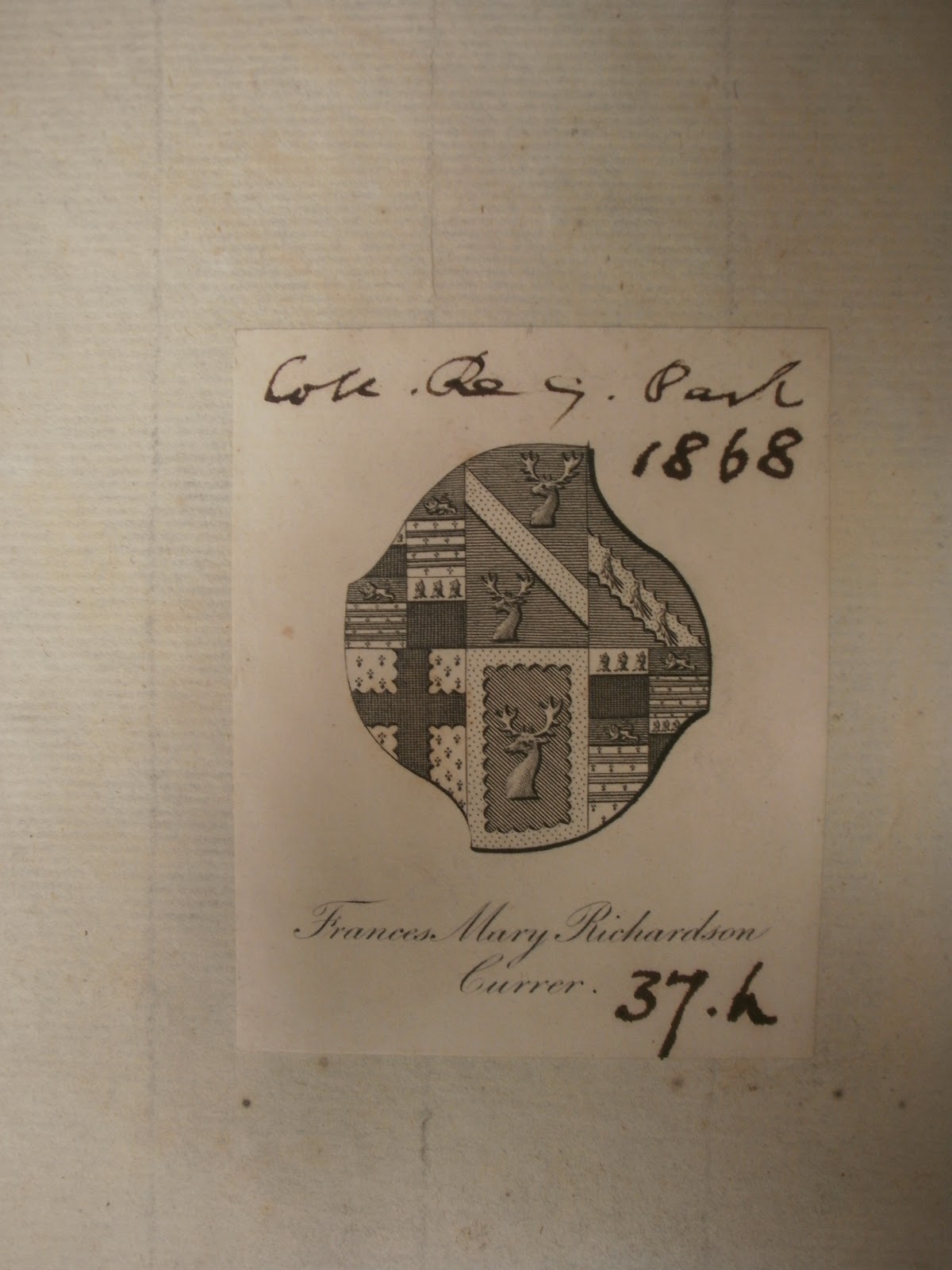 The core of the collection at Eshton was formed by the botanical and historical books of Frances’ great-grandfather, the physician and botanist Richard Richardson (1663–1741). A catalogue made in the life-time of Frances Currer reveals her interest in works on religion. She never married and after her death in 1861, her library (consisting of an estimated 20,000 volumes) was sold by her heirs. The main sale, at Sotheby’s on 30 July 1862, raised about £6000. At a second sale, in 1916, more than £3700 was made. As a consequence, Currer’s books can be found all over the world, including one here at the Angus Library.